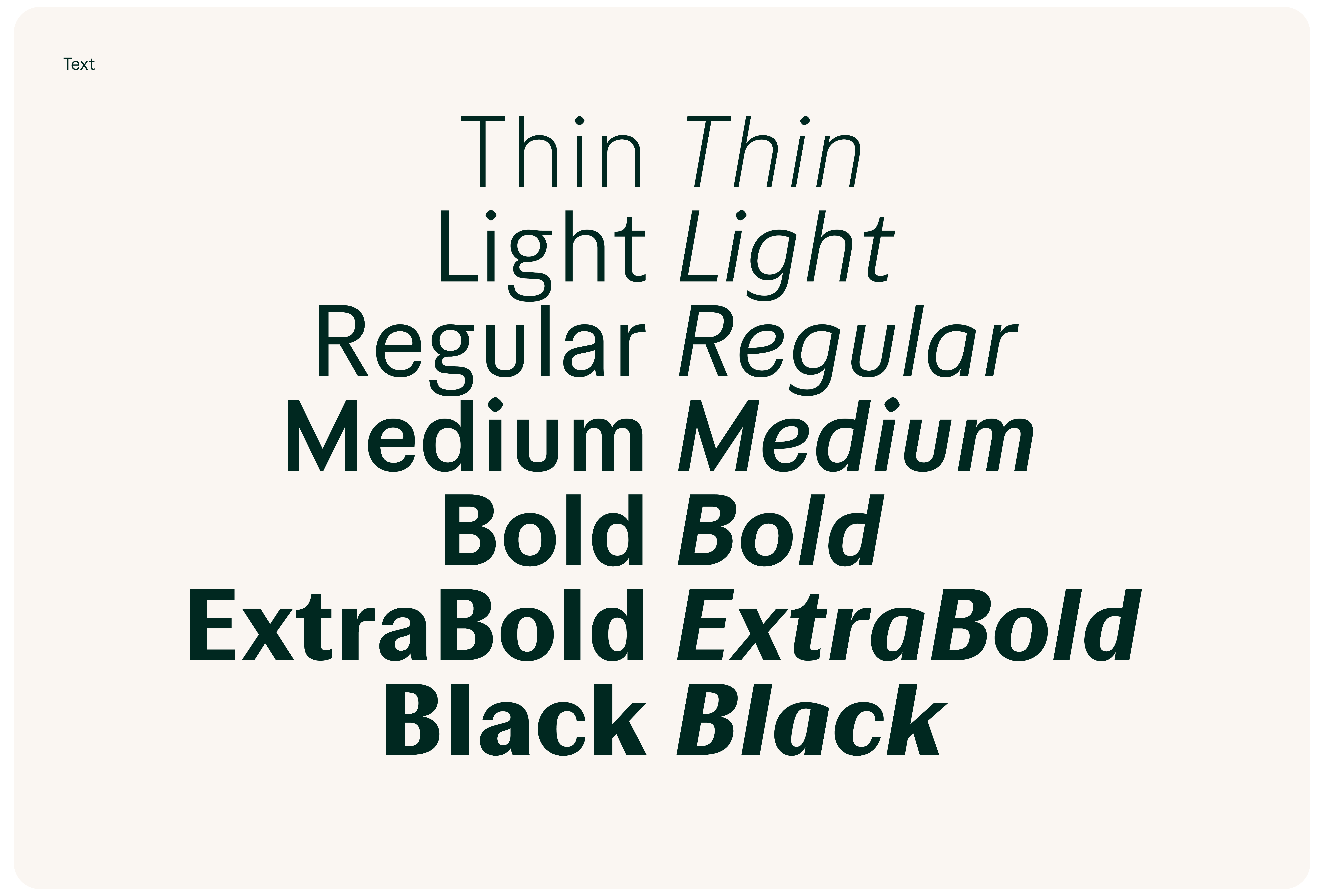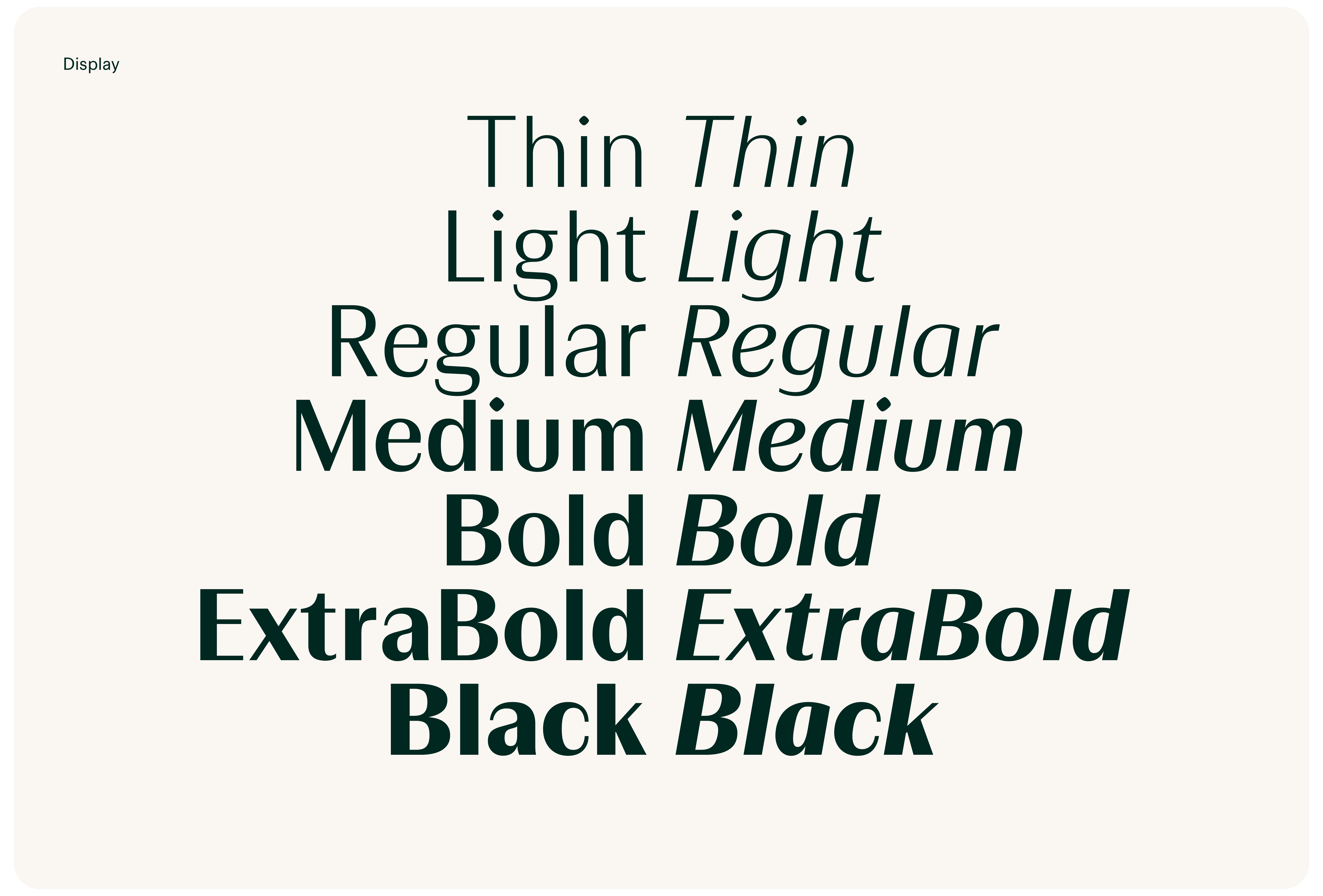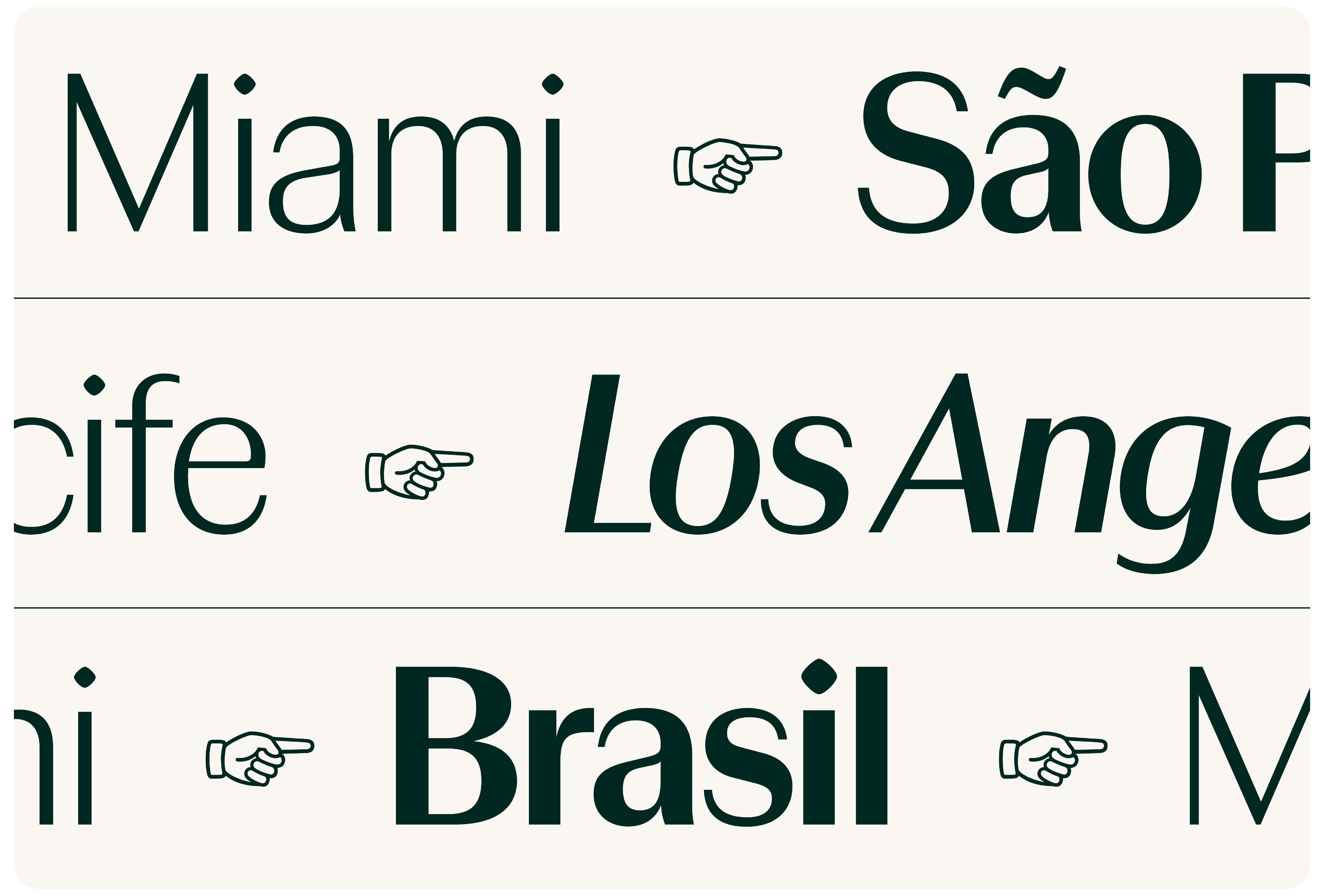 Desenhamos uma família tipográfica sem serifas sob medida com duas camadas distintas: Display e Text. Ambas compartilham a mesma estrutura, mas se diferenciam no equilíbrio entre expressão e funcionalidade. Os estilos Display trazem alto contraste — uma característica frequentemente encontrada em fontes serifadas clássicas — para conferir sofisticação, presença e personalidade aos títulos e às principais mensagens da marca. Já os estilos Text reduzem o contraste para aumentar a legibilidade e a acessibilidade em conteúdos mais longos e em interfaces digitais.