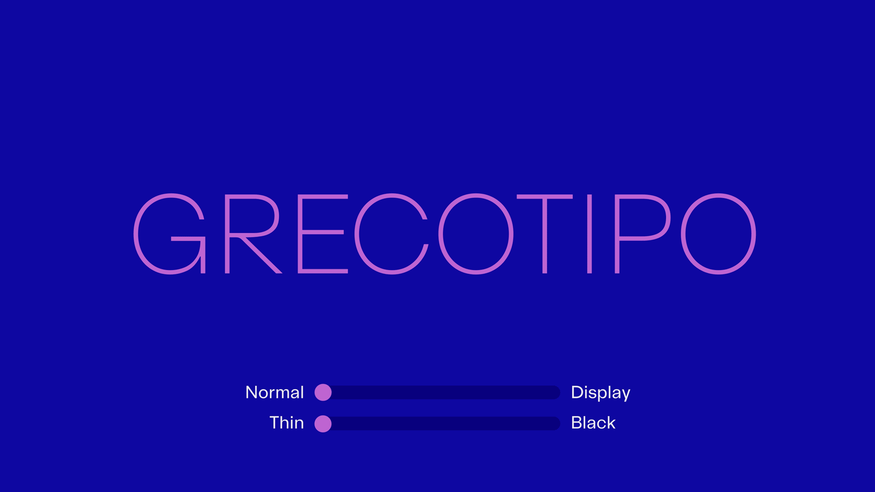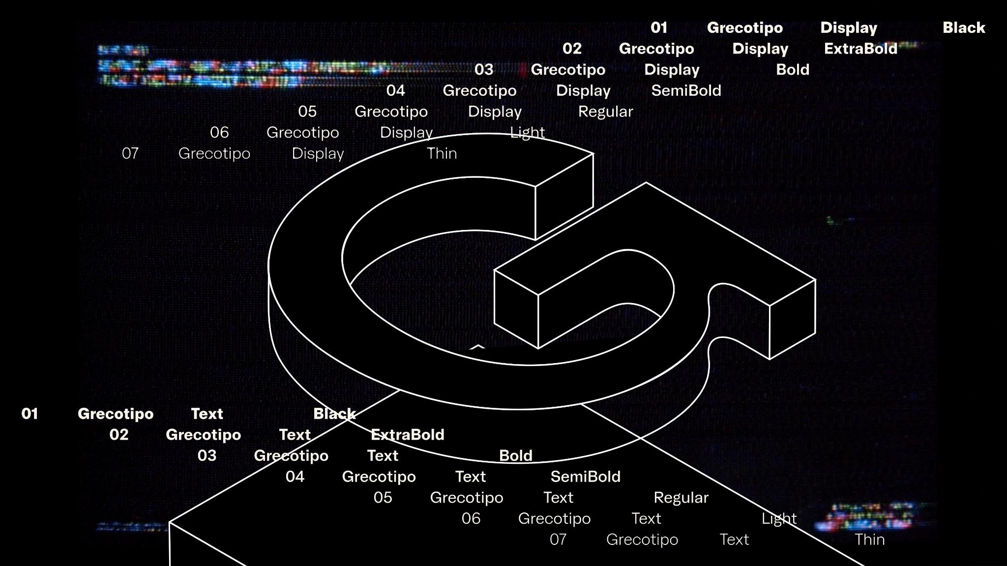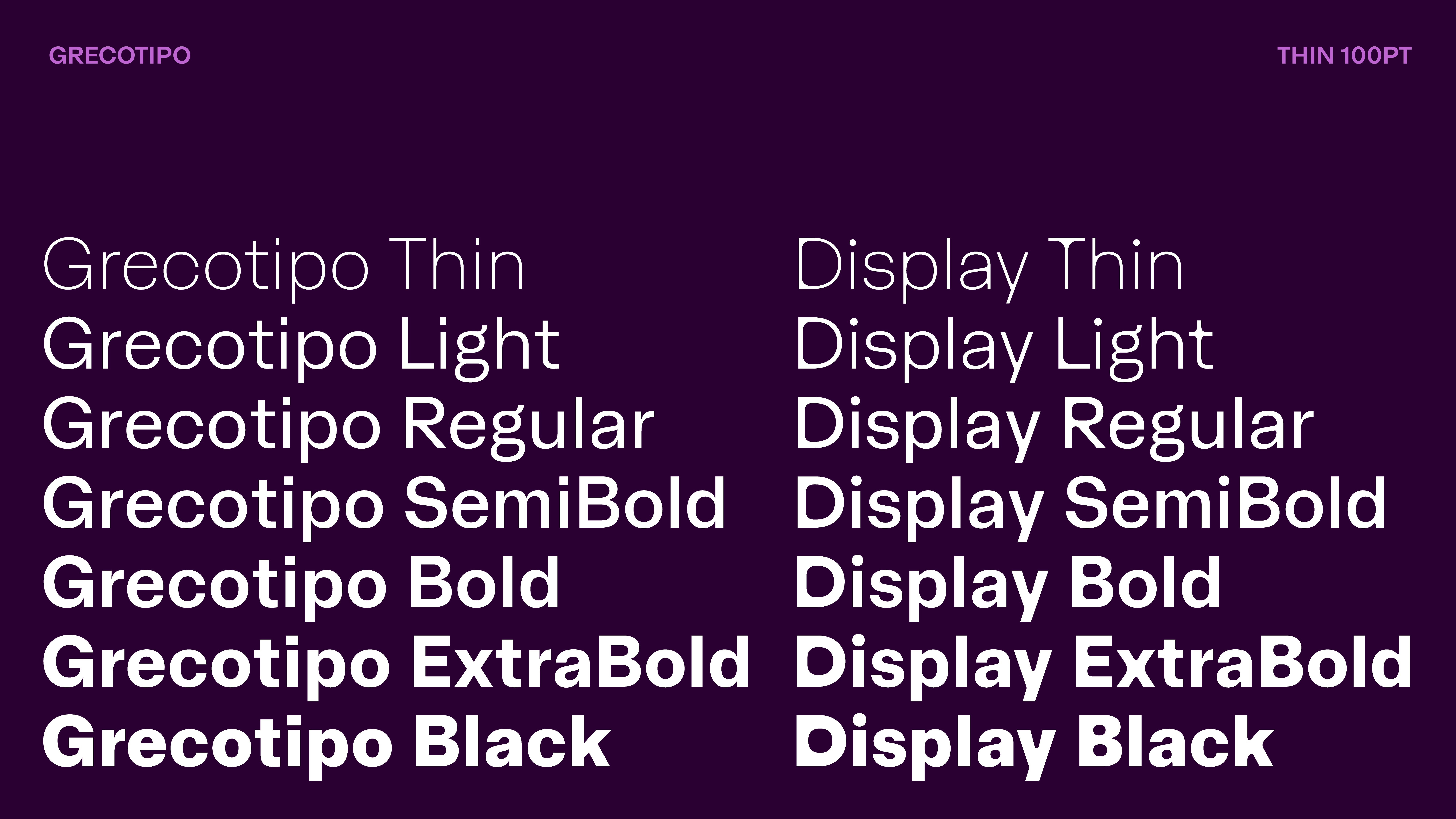 A Grecotipo explora o espaço entre o físico e o digital, uma linguagem visual frequentemente presente nas soluções de design da Greco. A família inclui oito pesos, de Thin a Black, com itálicos correspondentes, organizados em dois estilos — Normal e Display — totalizando 32 fontes. Essa estrutura faz da Grecotipo um sistema versátil, que equilibra personalidade e usabilidade.