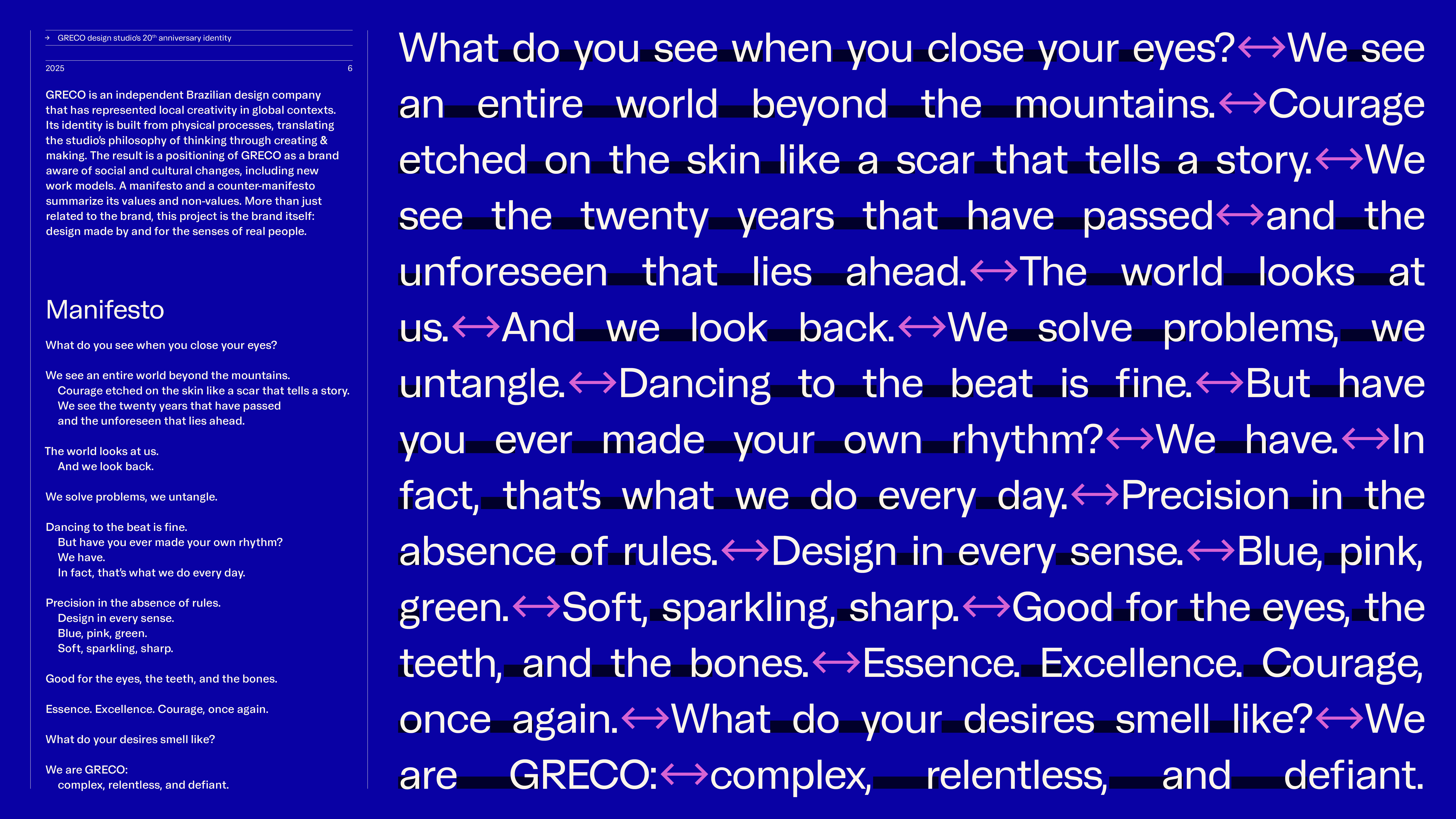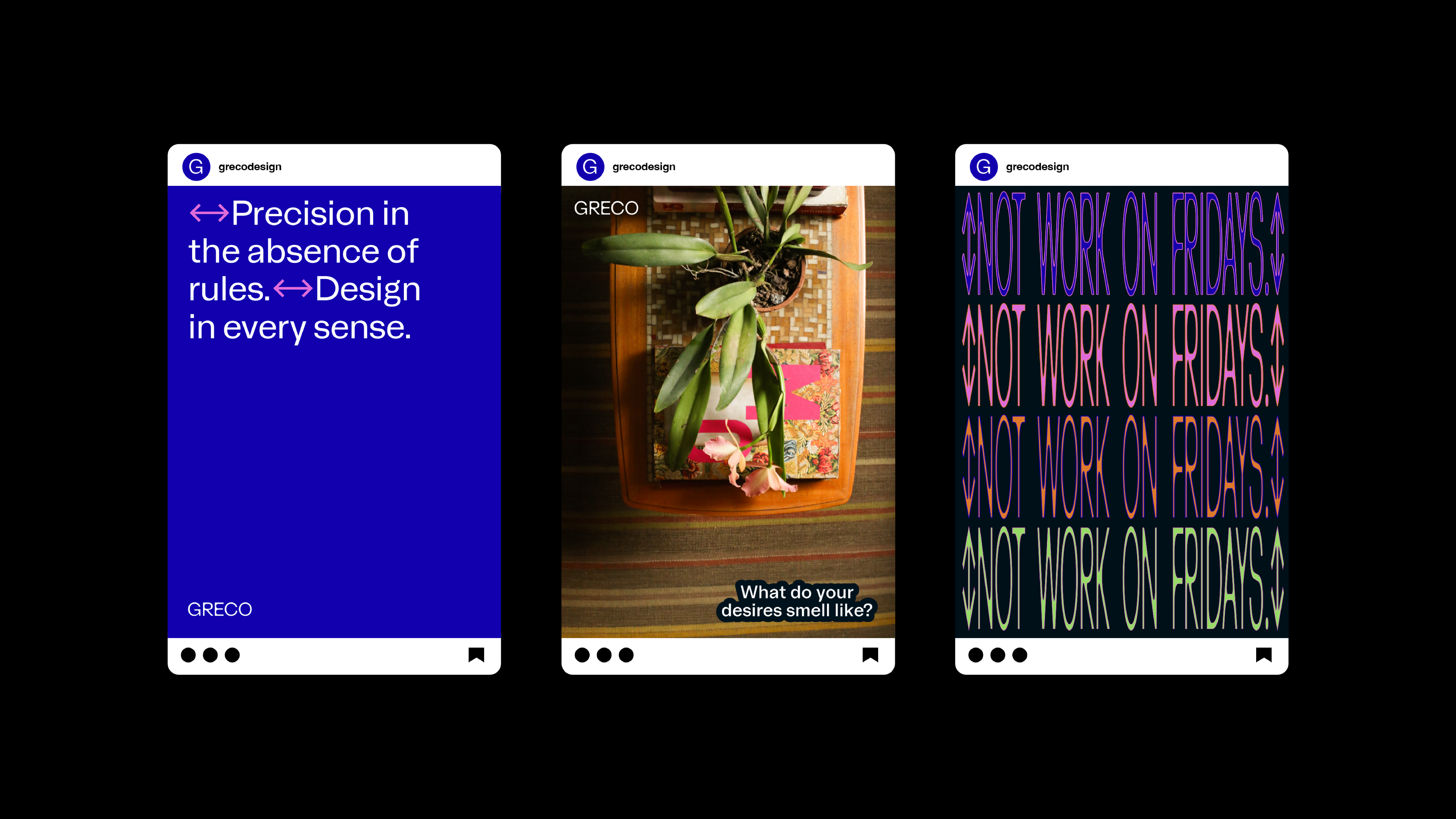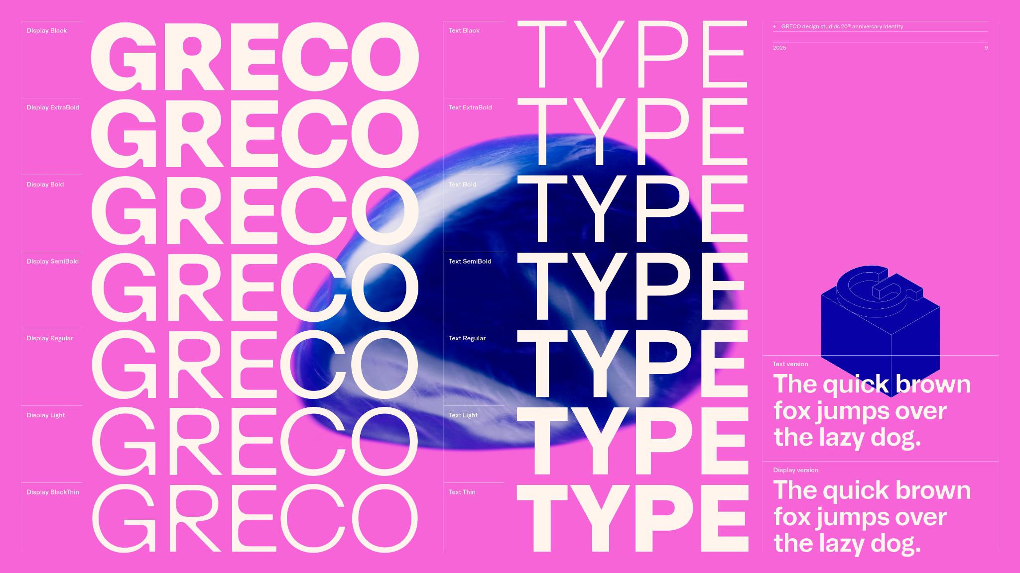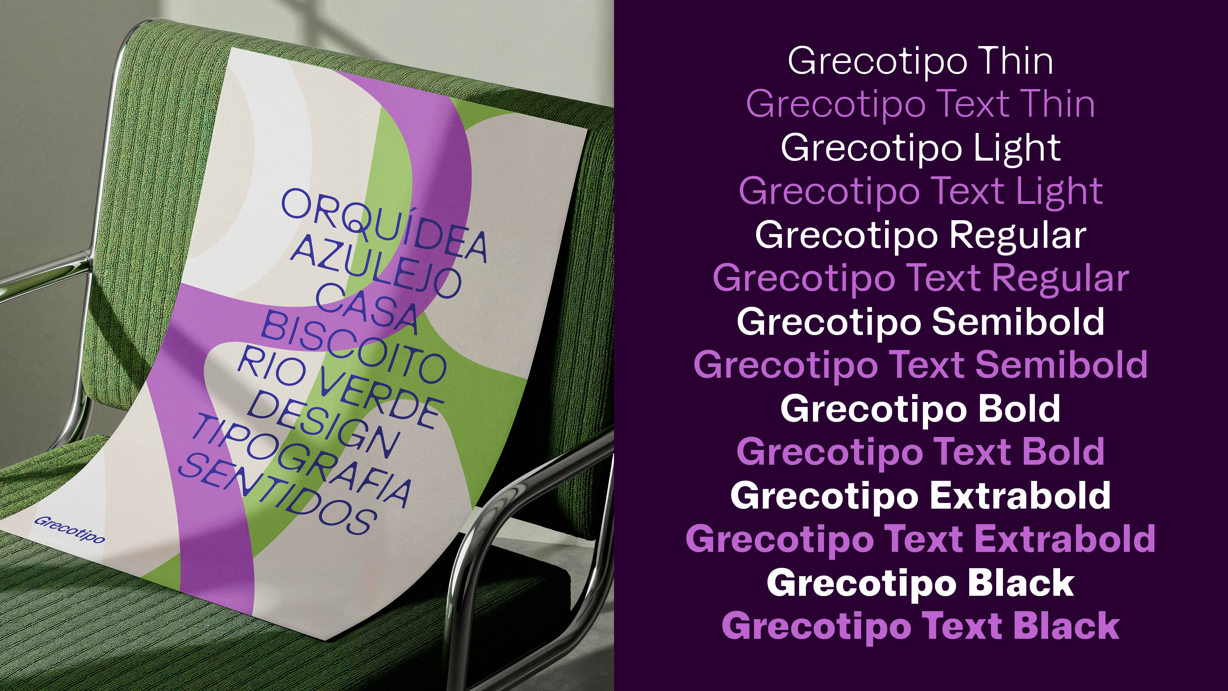 A Grecotipo explora o espaço entre o físico e o digital, uma linguagem visual frequentemente presente nas soluções de design da Greco. A família inclui oito pesos, de Thin a Black, com itálicos correspondentes, organizados em dois estilos — Normal e Display — totalizando 32 fontes. Essa estrutura faz da Grecotipo um sistema versátil, que equilibra personalidade e usabilidade.