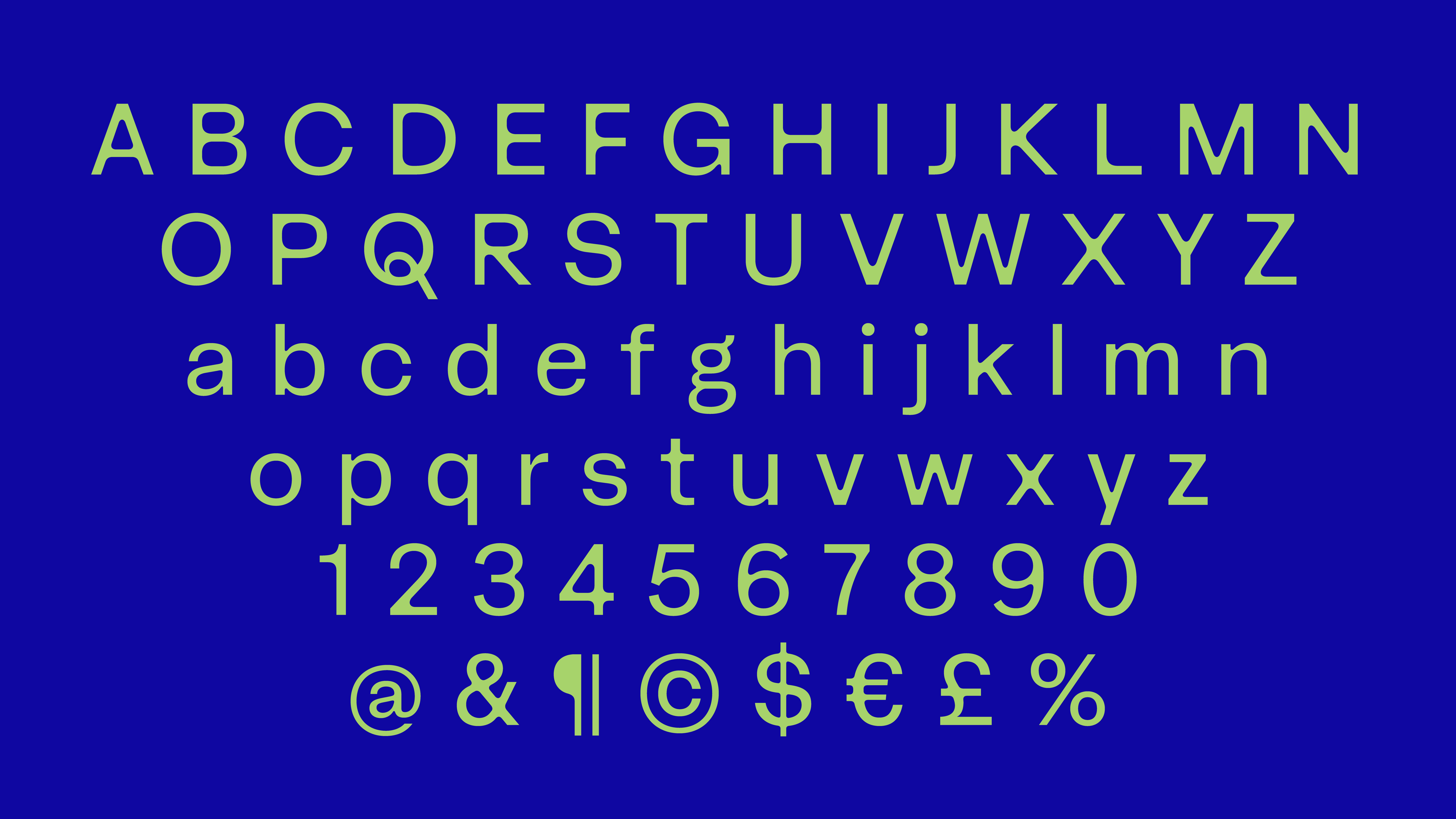 O estilo Display é o mais expressivo, com contraformas internas arredondadas que criam uma presença contemporânea e marcante. Já o estilo Normal segue a estrutura de uma tipografia grotesca, oferecendo familiaridade e clareza, ao mesmo tempo em que introduz gestos distintivos em caracteres como o “g” minúsculo.